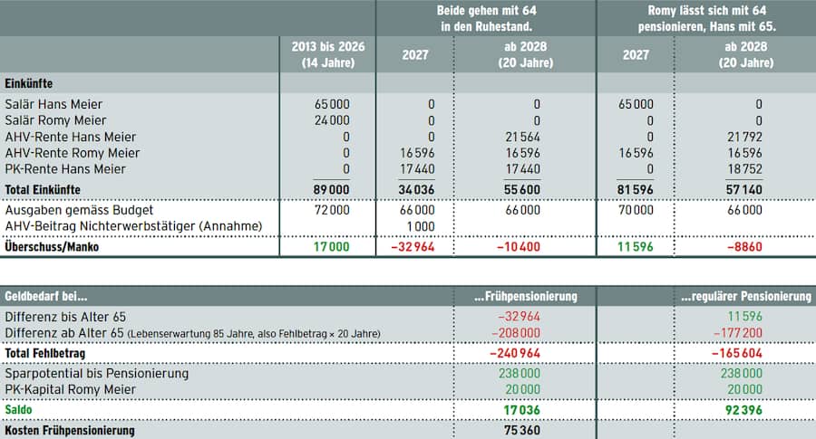 Romy und Hans Meier, beide 50, möchten mit 64 Jahren in Pension gehen. Romy will sich ordentlich pensionieren lassen, Hans ein Jahr vor dem AHV-Alter. Er will seine Pensionskassenrente vorbeziehen, die AHV-Rente aber erst ab 65. Romy Meier, die Teilzeit arbeitet, will sich ihr kleines PK-Kapital auszahlen lassen. Das stark vereinfachte Beispiel zeigt die Einkommenslücken bei vorzeitiger Pensionierung und vergleicht sie mit den Zahlen bei der ordentlichen Pensionierung. Der vorzeitige Ruhestand von Hans Meier kostet hier 75'360 Franken.