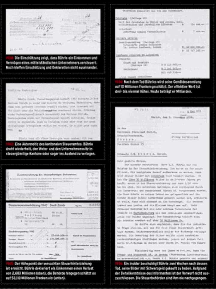 Dieser Ansicht war auch ein anonymer Insider, der dem kantonalen Steueramt Zürich am 9. Dezember 1956 einen «streng vertraulichen» Brief schrieb, in dem er Bührle als «Meister in der Steuerhinterziehung» bezeichnete und beifügte: «Ich halte es für meine Pflicht, Sie wenigstens darauf aufmerksam zu machen, dass 9⁄10 seiner Bilder mit schwarzem Geld bezahlt wurden. Er hat für über 30 Millionen Bilder in den letzten Jahren gekauft, wovon in der Steuererklärung nur rund 1⁄10 enthalten sind. Die schwarzen Zahlungen sind vorwiegend durch die Industrie- und Handelsbank Zürich AG vorgenommen worden. Als Herr Bührle zu seinen Lebzeiten gelegentlich auf die Gefahr dieser Bilder aufmerksam gemacht worden ist, erwiderte er stolz, dass sich niemand an ihn heranwage! Die Grossen lässt man laufen, und die Kleinen hängt man auf.»