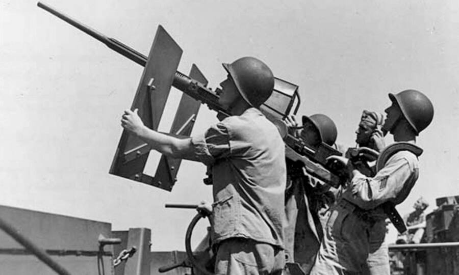 20mm Oerlikon-Maschinenkanone im Einsatz (am 5. Mai 1943 auf auf USS Enterprise). Bild: William T. Barr