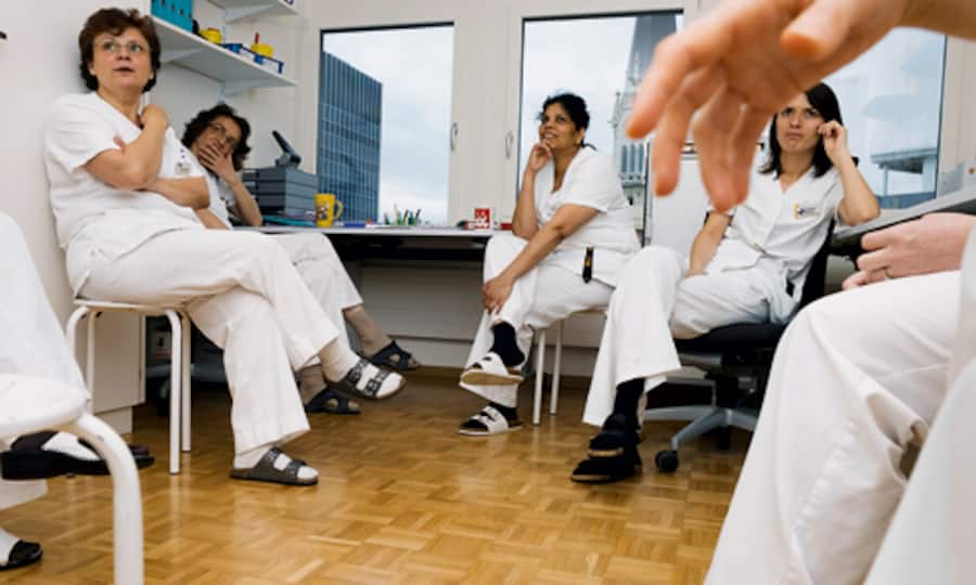 Freitag, Morgenrapport im Stationszimmer, fünfter Stock: Matty hat dem Team selbstgemachtes Curry für die Mittagspause mitgebracht. Sie hebt den Deckel der Plastikschüssel, jeder darf schnuppern. Nichts ist komisch daran, trotzdem kichern und glucksen bald alle. Mira, die Stationschefin, wird nach dem Morgenrapport sagen: «Die Stimmung im Team überträgt sich eins zu eins auf die Bewohner. Deshalb muss es den Mitarbeitern gutgehen.» Heiterkeitsausbrüche als Teil des Führungskonzepts. Es gab diese eine Situation: Frau H. hat gern Früchte, und sie hat einen künstlichen Darmausgang. Wenn Frau H. besonders viele Früchte gegessen hat, kann es passieren, dass das Beutelchen am Darmausgang den hervorquellenden Stuhl nicht mehr fassen kann. Gestern passierte es, der Beutel platzte, und der Stuhl spritzte heraus. Mira hätte richtig genervt sein können. Aber während des gestrigen Rapports im Stationszimmer sagte sie mit einem breiten Grinsen: «Der Vulkan ist wieder ausgebrochen.» Die anderen grinsten mit.