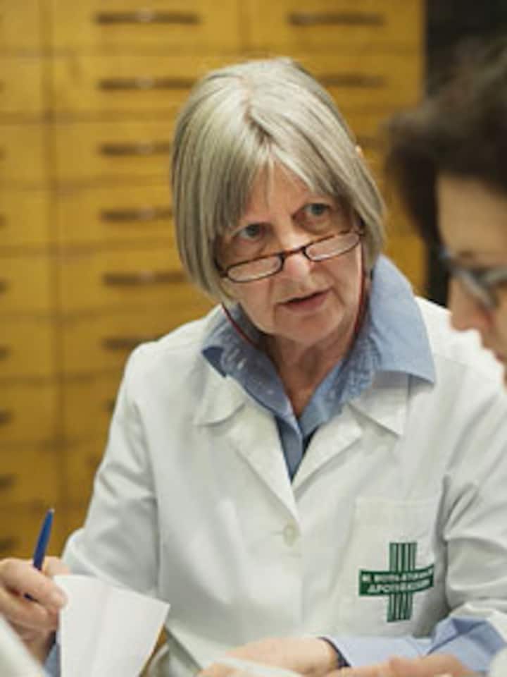 Sie alle tragen weisse Gesundheitsschuhe, nur die Füsse von Apothekerin Roth stecken in schicken Lederstiefeletten, die Lesebrille baumelt an roter Kette über weissem Kittel. Seit 15 Jahren arbeitet Monika Roth in der Bahnhofapotheke. Eigentlich ist sie seit zwei Jahren pensioniert. Da sie ihren Job aber so liebt, ist sie so oft wie möglich hier. «Ich gehe das Leben und die Patienten gern ganzheitlich an», sagt die Apothekerin.