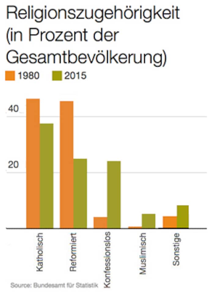Die Kirchen haben in der Schweiz einen schweren Stand: Gegenüber 1980 hat der Anteil konfessionsloser Menschen von 214'000 auf 1'651'000 zugenommen. Fast jede vierte in der Schweiz wohnhafte Person über 15 Jahren gehört damit keiner Religion mehr an. Am meisten verloren hat die reformierte Kirche (– 20,4 Prozent), doch auch die Katholiken verlieren an Anhängern (– 8,9 Prozent).