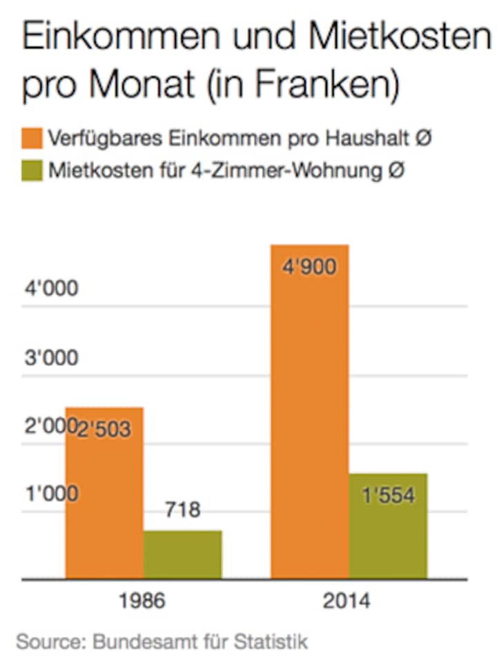 Doch nicht nur das verfügbare Einkommen ist gestiegen, sondern auch die Mietpreise haben angezogen. Setzt man die Wohnungskosten in einen Vergleich zum Einkommen, dann ist dieser Anstieg allerdings gering: 1986 ging rund 29 Prozent des verfügbaren Betrags für die Wohnungsmiete drauf, heute sind es knapp 32 Prozent. Gemäss Bundesamt für Statistik sind diese Zahlen seit 2008 sogar leicht rückläufig.