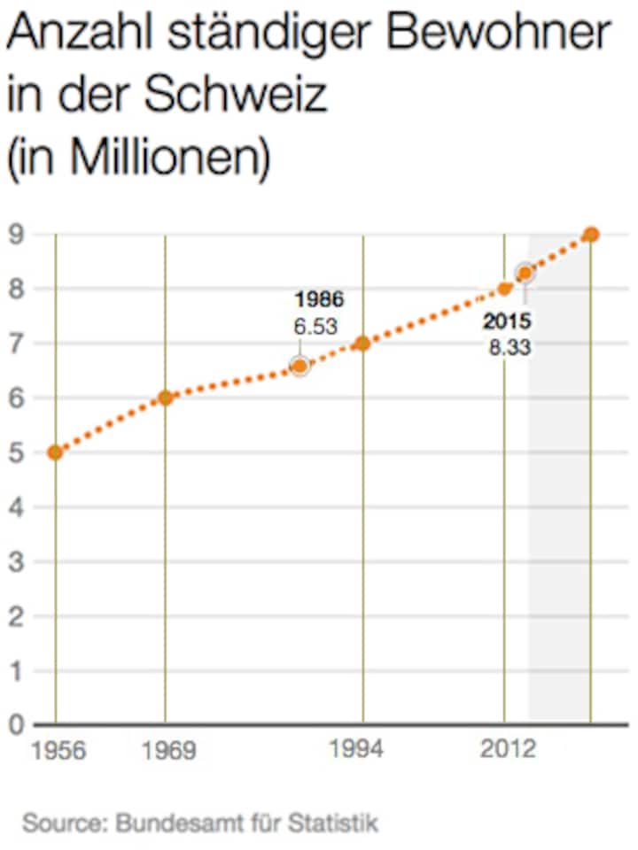 Das ist heute anders: Ende 2015 wohnten rund 8'327'000 Menschen in der Schweiz, was seit 1986 einem Anstieg von 27,5 Prozent entspricht. Rund drei Viertel davon haben den Schweizer Pass. Geht das Wachstum weiter wie in den letzten Jahren, dann dürfte schon 2023 die Schwelle von 9 Millionen Bewohnern überschritten sein. Innerhalb von 100 Jahren hätte sich die Bevölkerung damit fast verdreifacht. 39 Jahre ist es inzwischen her, dass letztmals mehr Menschen ausgewandert als eingewandert sind.