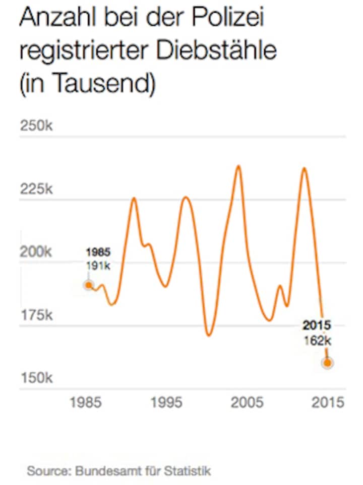Entgegen der landläufigen Meinung nehmen die Straftaten in der Schweiz keineswegs zu. Von Jahr zu Jahr schwanken diese Zahlen zwar, aber sie bleiben stabil. Als Beispiel dient hier die Anzahl registrierter Diebstähle: Diese lagen in den letzten 30 Jahren stets zwischen 160'000 und 240'000 pro Jahr. Mit 161'660 verzeichneten Diebstählen wurde 2015 der tiefste Wert seit Beginn der zugänglichen Statistiken im Jahr 1981 erreicht.