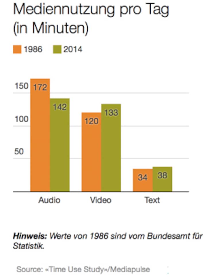 Der durchschnittliche Medienkonsum eines Schweizers beträgt heute etwas mehr als 5 Stunden pro Tag. Er hat sich damit in den letzten 30 Jahren leicht verringert. Beliebteste Medien bleiben Audio und Video. Während die Radiosender an Hörern verloren, blieb das Fernsehen stabil. Live-TV macht mit 118 Minuten den mit Abstand grössten Anteil aus.