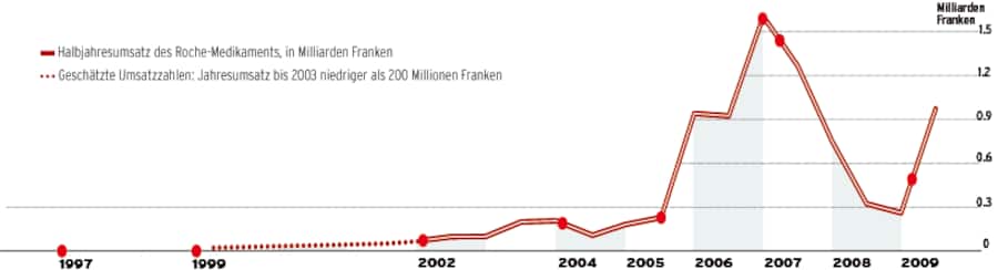 | 2002 | Die saisonalen Grippen verlaufen mild, die Verkaufszahlen enttäuschen. Bis 2003 schafft Tamiflu nicht einmal den Sprung unter die 20 meistverkauften Roche-Medikamente. |