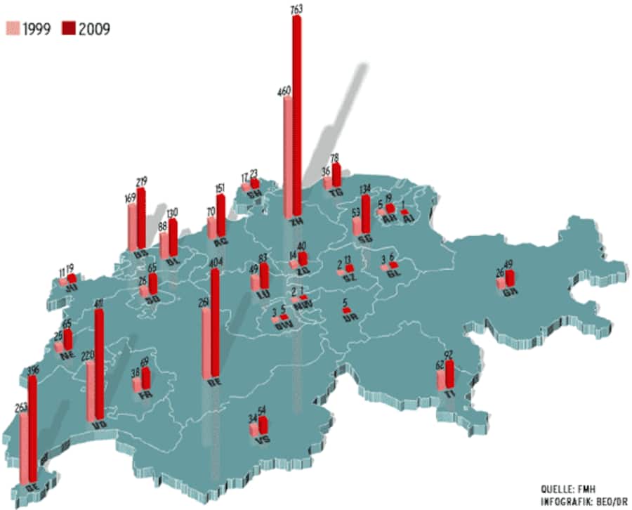 Gesamte Schweiz: 1937 Psychiater im Jahr 1999; 2009 waren 3295 Psychiater tätig.