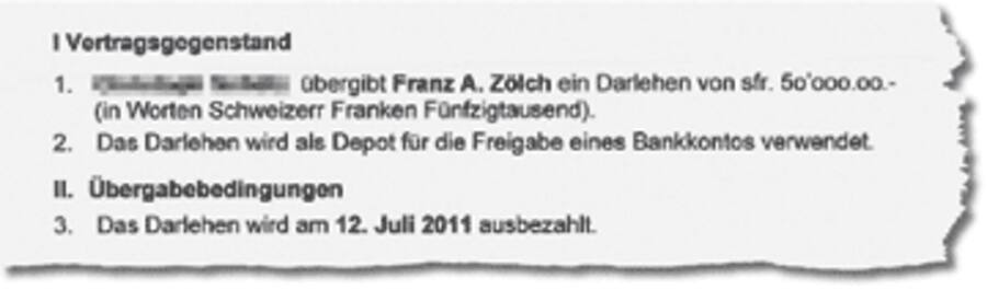 Mitte Juli telefoniert Zölch einem seiner Kunden. Fünf Millionen Euro lägen auf einem Konto in Genf, vertraut er ihm an. Geld aus einem Geschäft, das mit dem 9/11-Attentat zerstört worden sei. Für seine bereits erbrachten Vorleistungen habe man ihn jetzt endlich entschädigt. Die Sache hat einen Haken: Um an das Geld zu kommen, braucht Zölch angeblich 50'000 Franken – sofort, aber nur für wenige Tage. Er benötige das Darlehen als «Depot für die Freigabe eines Bankkontos». So steht es im Vertrag, den Zölch dem Kunden vorlegt.