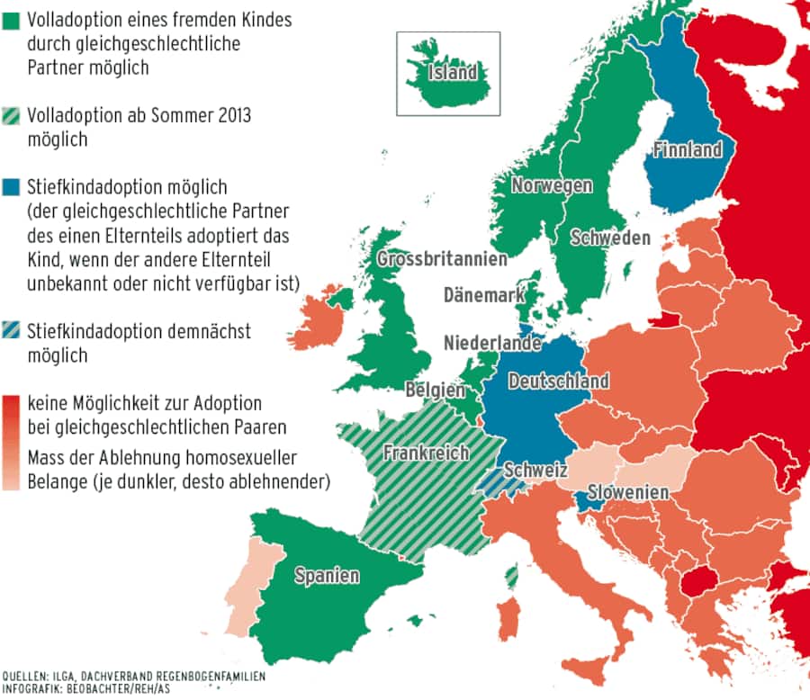Trotz der Revision hinkt die Schweiz aber auch in Zukunft vielen anderen europäischen Ländern hinterher. In den meisten westeuropäischen Ländern können Lesben und Schwule nicht nur die Kinder des Partners, sondern auch fremde Kinder adoptieren.