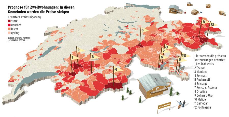 Doch laut Mächler hat die Nachfrageschwäche keinen Bestand: «Die Verknappung des Angebots durch die Zweitwohnungsinitiative wird dazu führen, dass die Preise spätestens in vier, fünf Jahren anziehen.» Auch die Beratungsfirma Wüest und Partner geht davon aus, dass die Initiative preistreibend wirkt. Paradoxerweise besonders in Gemeinden mit ohnehin schon sehr hohen Preisen (siehe Grafik oben).