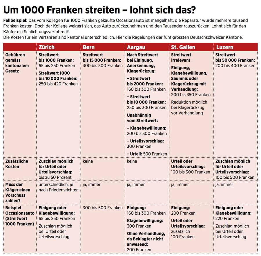 Ein Schlichtungsverfahren kann sich auch für Streitigkeiten um wenige hundert Franken lohnen. Fragen Sie den Friedensrichter im Voraus nach der Höhe der Kosten. «Gerade junge Leute wissen kaum mehr, dass ein Schlichtungsverfahren möglich ist – dabei ist es der billigste und schnellste Weg, zu seinem Recht zu kommen», sagt Markus Zubler vom Schweizerischen Verband der Friedensrichter und Vermittler. Bertrand Hug, Vermittler im Kanton St. Gallen, drückt es so aus: «Die Chance, eine Einigung zu erzielen, ist sehr gross. Und eine neutrale Drittperson hilft den Parteien bei der oft verkorksten Kommunikation.»