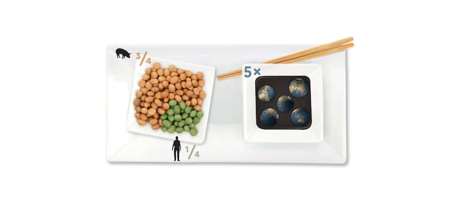 Boden: Drei Viertel der Agrarflächen weltweit werden zur Produktion von Fleisch verwendet – nur ein Viertel für den Anbau von Lebensmitteln. Würden alle Menschen so viel Fleisch konsumieren wie wir, bräuchte man fünfmal so viel Agrarland für die Produktion.