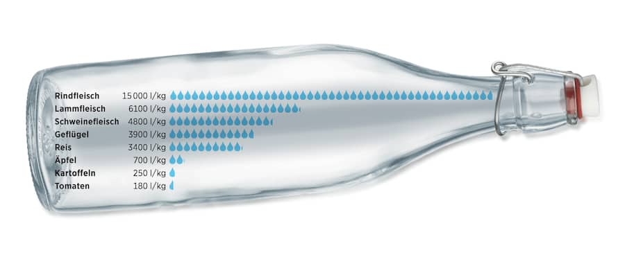 Wasser: Um ein Kilo Rindfleisch herzustellen, werden etwa 15'000 Liter Wasser benötigt. Fast 99 Prozent davon werden für die Produktion von Futter aufgewendet. Mit dieser Wassermenge könnte man ein Jahr und vier Monate lang jeden Tag duschen.
