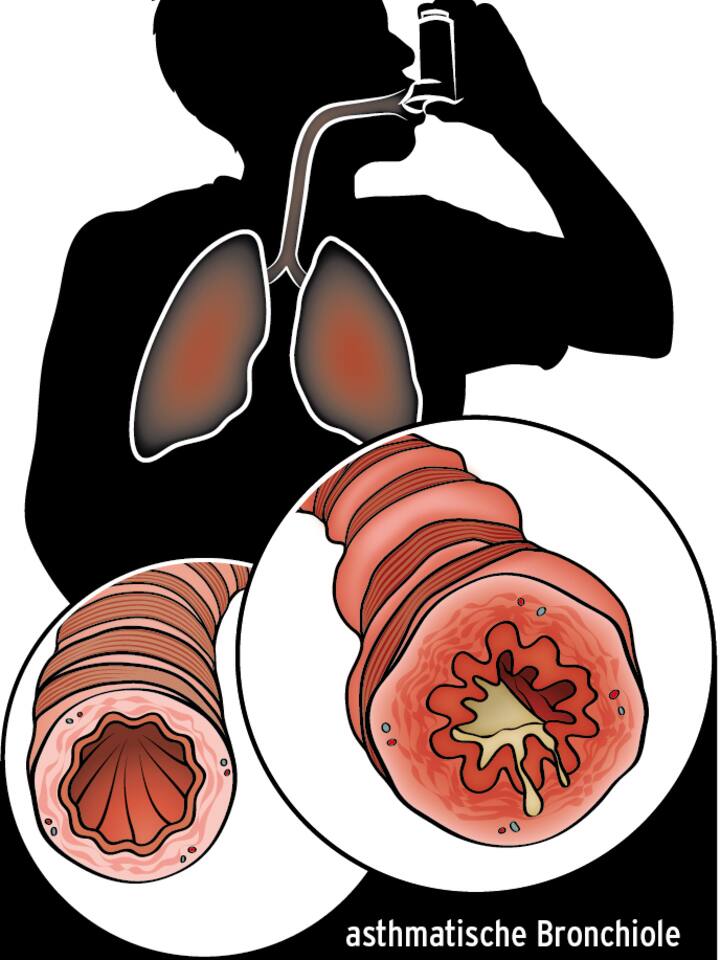 In der Lunge verzweigen sich die Bronchien in ein immer feineres Röhrensystem: Bronchien werden zu Bronchiolen, und diese enden in den Lungenbläschen. Wer an Asthma leidet, hat chronisch entzündete Atemwege, was wiederum zu anfallartigen oder dauerhaften Verengungen der Bronchien und Bronchiolen führt. Die Muskulatur um die Atemwege zieht sich zusammen, die Schleimhaut schwillt an, und die Schleimbildung verstärkt die Verengung zusätzlich. Dadurch wird das Atmen anstrengend, und er Körper versucht durch Husten, die Atemwege vom überflüssigen Schleim zu befreien.