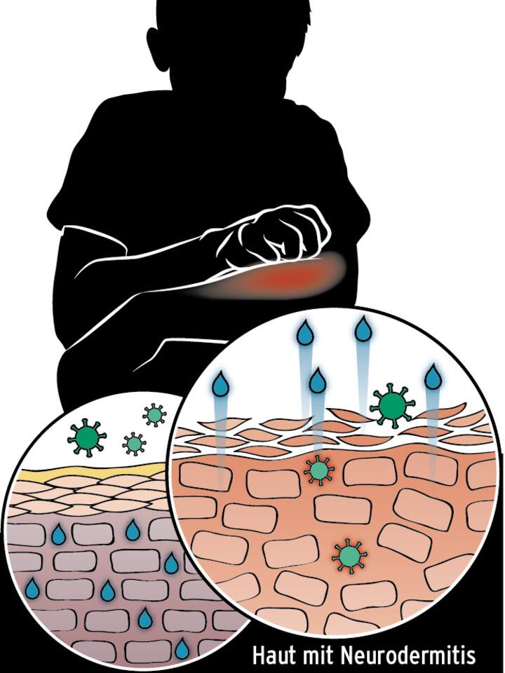 Es sind nicht immer allein die Allergien, die Neurodermitis auslösen. Es wird zu wenig Talg produziert, was die Haut trocken und spröde macht. So verliert sie ihre Barriere- und Abwehrfunktion, wird anfällig für Ekzeme und beginnt zu jucken. Wichtig ist es, einen Umgang mit dem quälenden Juckreiz zu finden, ohne zu kratzen. Die betroffene Stelle soll man kühlen, was den Juckreiz lindert, oder darauf klopfen, was den Reiz vielleicht ebenfalls mildert und nicht zu offenen Stellen führt, die sich entzünden können. Das Allergiezentrum Schweiz bietet spezielle Schulungen zum Umgang mit dem Juckreiz an.