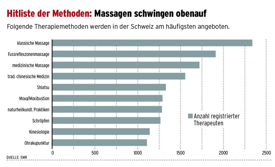 Das Angebot an Heilmethoden ist in der Schweiz unüberschaubar. Das Erfahrungsmedizinische Register (EMR) listet rund 200 auf – praktiziert werden mehr als doppelt so viele. Hilfe bei der Suche nach einem qualifizierten Therapeuten bietet das Internetregister EMindex.