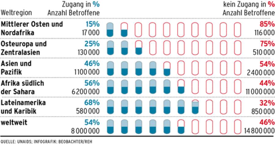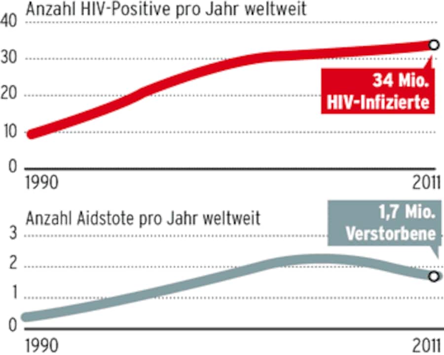 Noch heute sterben mehr Menschen an Aids als in allen politischen Konflikten zusammen. Der jüngste UNAIDS-Bericht, der auf Daten aus 150 Ländern basiert, zählte Ende 2011 weltweit 34 Millionen HIV-Infizierte. Sieben Millionen hatten keinen Zugang zu einer medizinischen Behandlung. 2,5 Millionen steckten sich neu an. 1,7 Millionen Menschen starben. Seit der Entdeckung des Virus vor 30 Jahren verzeichnete die Uno 35 Millionen Aidstote. Aids ist heute die dritthäufigste Todesursache.