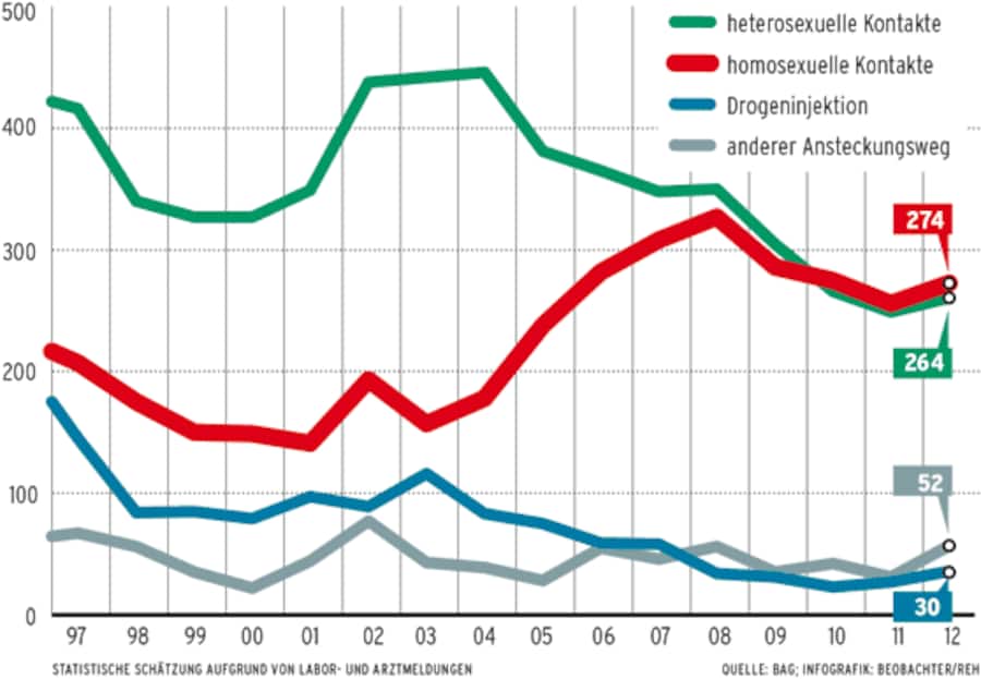 In der Schweiz, wo überdurchschnittlich viele HIV-Positive leben, sieht die Bilanz ungleich besser aus. 17 000 Menschen sind Träger des Virus, jeder zehnte Schwule ist infiziert. Stärker betroffen sind nur Migranten aus Schwarzafrika. Die Versorgung HIV-Positiver ist beispielhaft. 70 Prozent gehen einer geregelten Arbeit nach, jeder zweite ist sogar voll erwerbstätig.