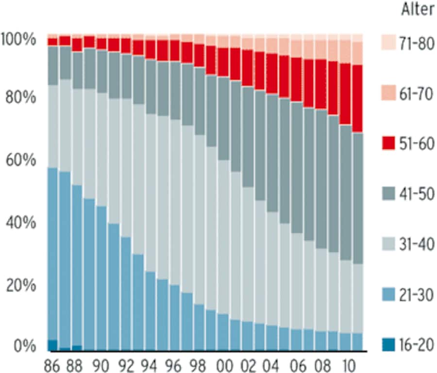 HIV-Infizierte in Altersgruppen: Anteil an der Gesamtzahl der Patienten in der Schweiz, in Prozent