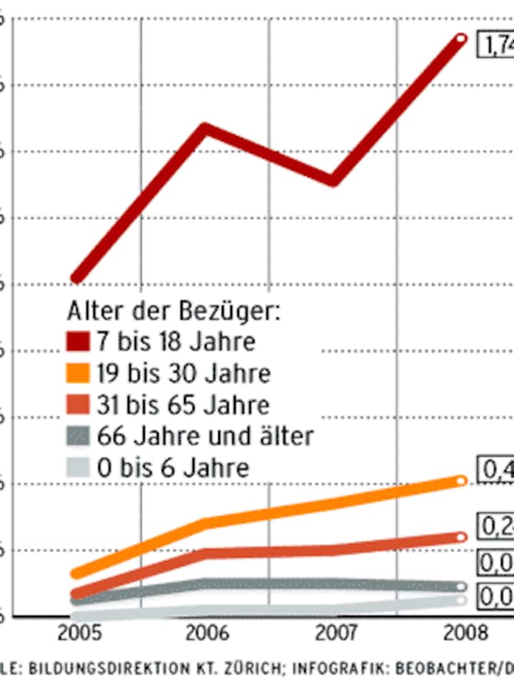 Am häufigsten trifft es die 14-jährigen Knaben: Gut 4 von 100 Buben im Kanton Zürich nehmen in diesem Alter Ritalin oder ein ähnliches Präparat mit dem Wirkstoff Methylphenidat. Insgesamt ist der Anteil der Schülerinnen und Schüler, die medikamentös gegen ihre Aufmerksamkeits-/Hyperaktivitätsstörung (ADHS) behandelt werden, zwischen 2005 und 2008 von 1 auf 1,7 Prozent gestiegen, wobei der Anstieg besonders unter den Knaben markant ausgefallen ist: von 1,6 auf 2,7 Prozent.