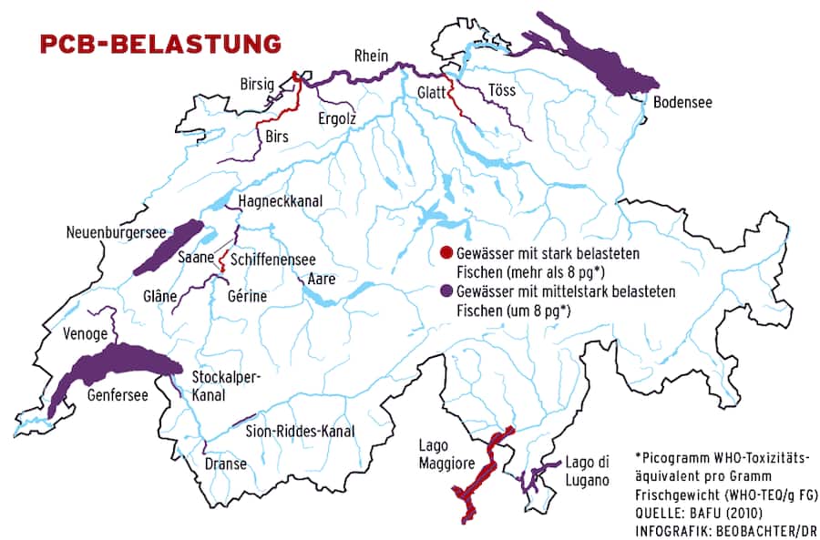 Erst seit 2007 werden Gewässer systematisch auf PCB untersucht. Der bisherige Wissensstand: Stark belastet sind Fische aus der Saane, der Birs, der Glatt, dem Hochrhein und dem Lago Maggiore. Das gilt vor allem für fettreiche Arten, da sich PCB im Fettgewebe ablagern. Die Behörden raten vom Verzehr dieser Fische ab, ihr Verkauf ist verboten.
