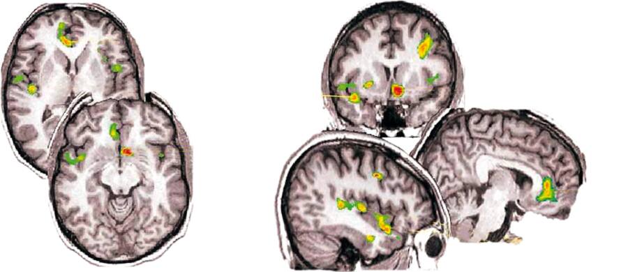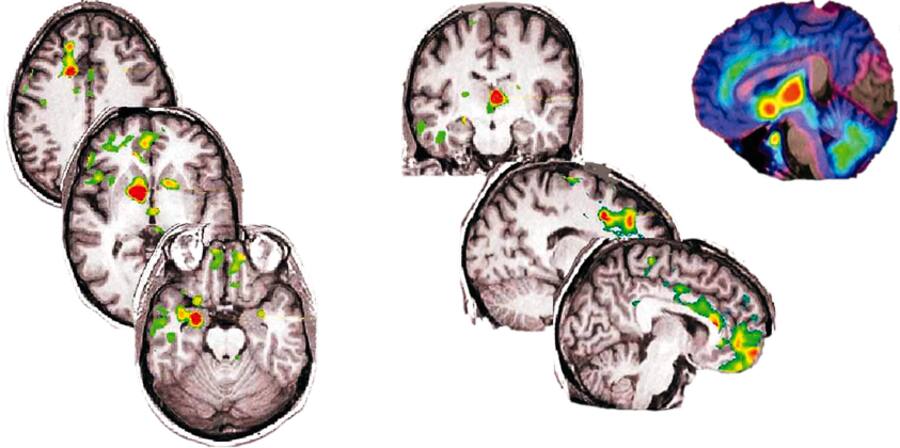 Diesen Umstand machte sich Placebo-Forscher Jon-Kar Zubieta von der University of Michigan zunutze. Er erzeugte bei 14 gesunden Freiwilligen Schmerzen, indem er ihnen eine Kochsalzlösung in die Kiefermuskeln injizierte. Dann verabreichte er eine Spritze mit angeblich schmerzlindernder Wirkung. Bald vermeldeten die Probanden ein Nachlassen ihrer Schmerzen. Gleichzeitig liessen die PET-Bilder erkennen, dass in bestimmten Regionen ihres Gehirns Endorphin-Bindungsstellen aktiviert wurden (siehe nachfolgende Grafik). Die hirneigene Schmerzabwehr war in Aktion getreten. «Dies versetzt der Idee, dass der Placebo-Effekt ein rein psychologisches statt physikalisches Phänomen sei, einen weiteren schweren Schlag. Die Verbindung zwischen Geist und Körper ist ziemlich klar», sagt Zubieta.