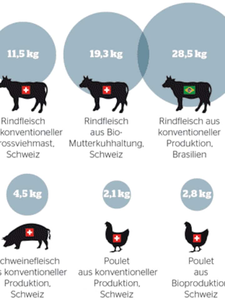 Schweizer Fleisch hat gegenüber Produkten aus dem Ausland vor allem den Vorteil des besseren Tierschutzes. Biofleisch schneidet in der Gesamtschau generell etwas schlechter ab. Der Grund: Die Bioproduktion erfordert mehr Landfläche und mehr Futter, weil sich die Tiere mehr bewegen dürfen. Dafür garantiert sie eine tiergerechte Haltung.
