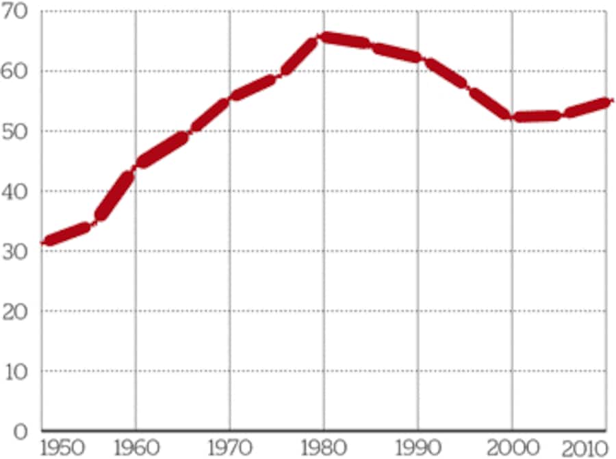 Schweizerinnen und Schweizer essen in ihrem Leben durchschnittlich vier Rinder, drei Kälber, 31 Schweine und 1016 Hühner. Über 430'000 Tonnen Fleisch gehen hierzulande jährlich über den Ladentisch, was einem Pro-Kopf-Konsum von 53,6 Kilogramm entspricht. Anfang der achtziger Jahre hatte der Konsum mit rund 64 Kilogramm den Höhepunkt erreicht (siehe obige Grafik). Über die Gründe für den Rückgang lässt sich nur spekulieren. Die Branchenorganisation Proviande nimmt an, dass die Ende der siebziger Jahre aufkommenden Themen Tierwohl und Umweltschutz einen Einfluss hatten. In den Neunzigern wirkte sich wohl auch die Wirtschaftskrise auf den Fleischkonsum aus.