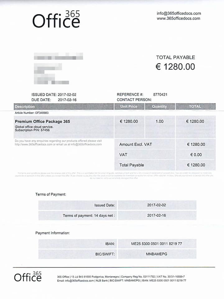 Wie sieht eine Rechnung aus? Zum Beispiel so: Oben als Absender eine Firma namens 365 Office, darunter der Adressat, ein KMU aus Zürich. Dann das Produkt: «Premium Office Package 365», eine Bürosoftware. Ein Stück kostet 1280 Euro, zahlbar innert 14 Tagen.