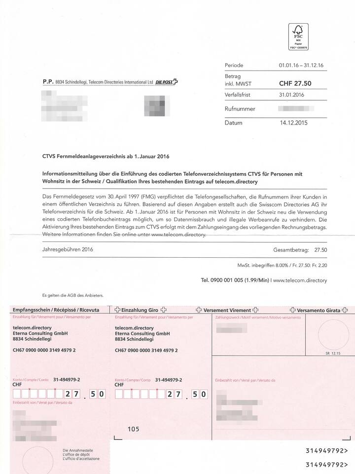 Wer eine solche Rechnung bekommt, soll sie getrost zum Altpapier legen. Auf keinen Fall sollten Sie sie bezahlen! Denn der Eintrag schützt mit Sicherheit nicht vor Datenmissbrauch und illegalen Werbeanrufen, wie im Brief behauptet wird. Rufen Sie auch die angegebene Telefonnummer nicht an, da diese CHF 1.99 pro Minute kostet.