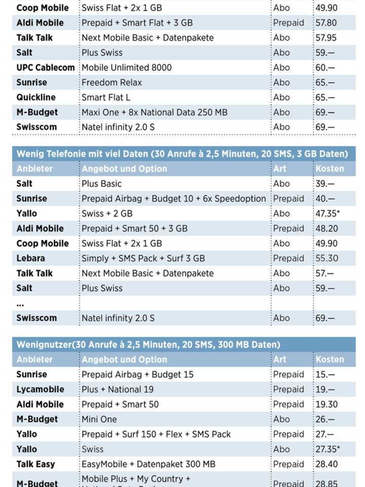 Allerdings: Bei der Nutzung spielen viele Faktoren mit. «Entscheidend ist etwa, in welches Netz man wie oft telefoniert», sagt Zadori. So bieten Salt mit Plus Start und Sunrise mit Freedom Start All-inclusive-Abos für rund 20 Franken pro Monat, die aber nur Anrufe ins eigene Netz umfassen. Einige Anbieter rechnen zudem sekundengenau ab, bei andern zahlt man angebrochene Minuten ganz, wieder andere verrechnen eine Pauschale pro Anruf.