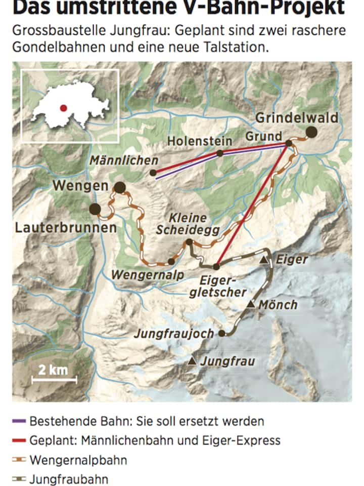 Hinter der Schliessungsandrohung steckt etwas anderes als die vorgeschobenen «betrieblichen Gründe». Es geht um den Eiger-Express, das ehrgeizige 200-Millionen-Projekt der Jungfraubahnen. Es sieht den Bau zweier Seilbahnen vor, in der Region spricht man von V-Bahn. Die eine Bahn soll die bestehende Seilbahn von Grindelwald auf den Männlichen ersetzen. Die zweite soll zur Station Eigergletscher führen, wo die Gäste auf die Jungfraubahn umsteigen können, um auf das Jungfraujoch zu gelangen.