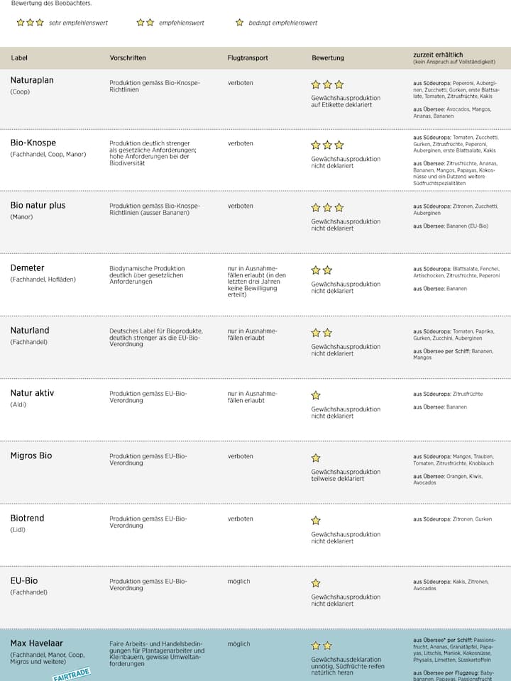 Konsumenten, die die Schifffracht favorisieren, müssen auf die freiwillige Deklaration der Anbieter hoffen. Wenn der Transport nicht ausgewiesen ist, erhält man nur auf Umwegen Klarheit; und es braucht einen langen Atem angesichts der zahlreichen Bio- und Fair-Trade-Labels, die Grossverteiler und Fachläden in der Schweiz führen (siehe Biolabel-Vergleich):