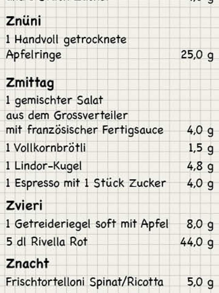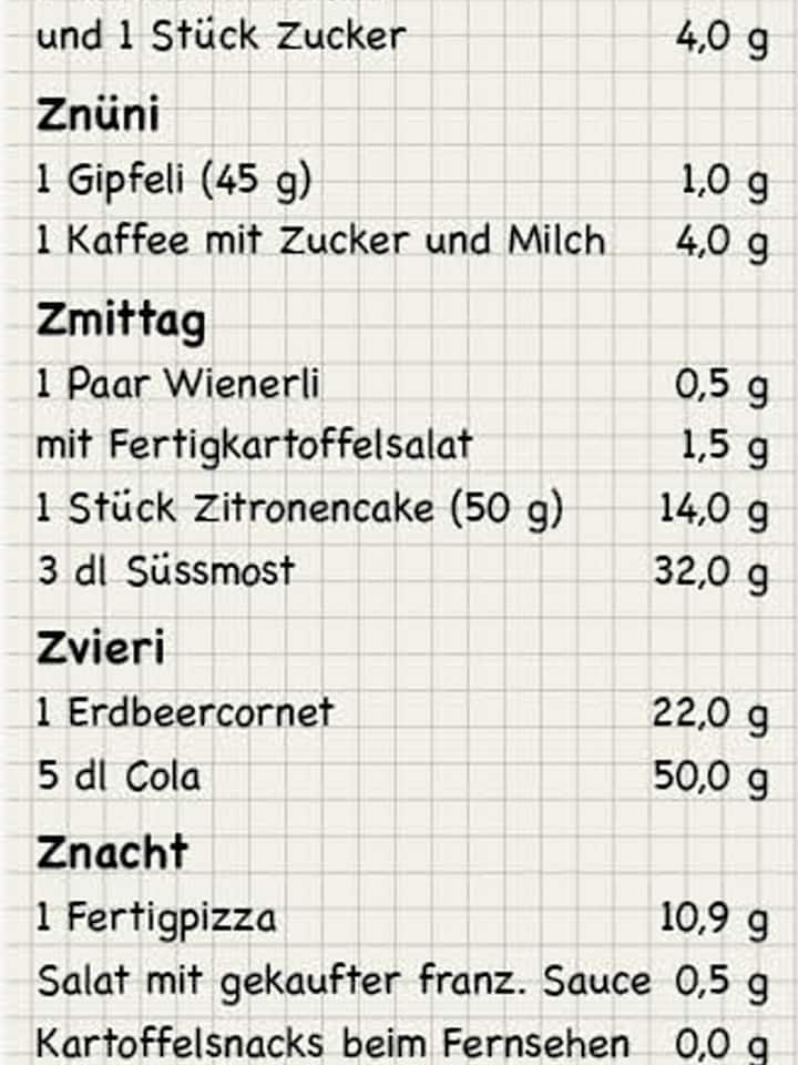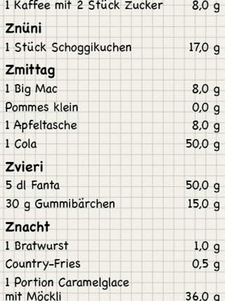 Manche Produkte, die gerade von Kindern gern gegessen werden, sind wahre Zuckerbomben. Es gibt Frühstücksflocken mit 37 Prozent Zucker. Das ist so viel wie in Schokoladekeksen – doch niemand würde seinem Kind einen Teller Guetsli zum Frühstück hinstellen. Und: Wer selbst Gemüsesuppe kocht, streut keinen Zucker hinein, aber in Fertigsuppen stecken oft gleich mehrere Zuckerwürfel pro Schale. Auch Salatsaucen, Fertigpizzas, Schinken oder Big Macs enthalten Zucker. Sogar Menschen, die sich bewusst ernähren, nehmen häufig zu viel Zucker zu sich.