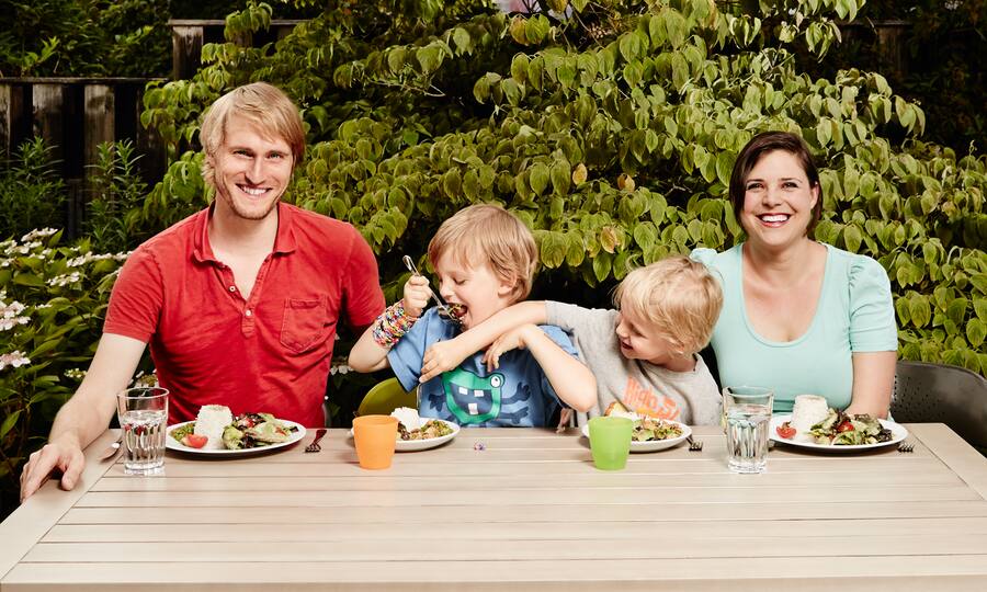 «Ich sah auf dem Teller plötzlich die Leichen von Hühnern liegen»: Adam und Andrea Thomas, Söhne Noah, 6, und Sam, 3.