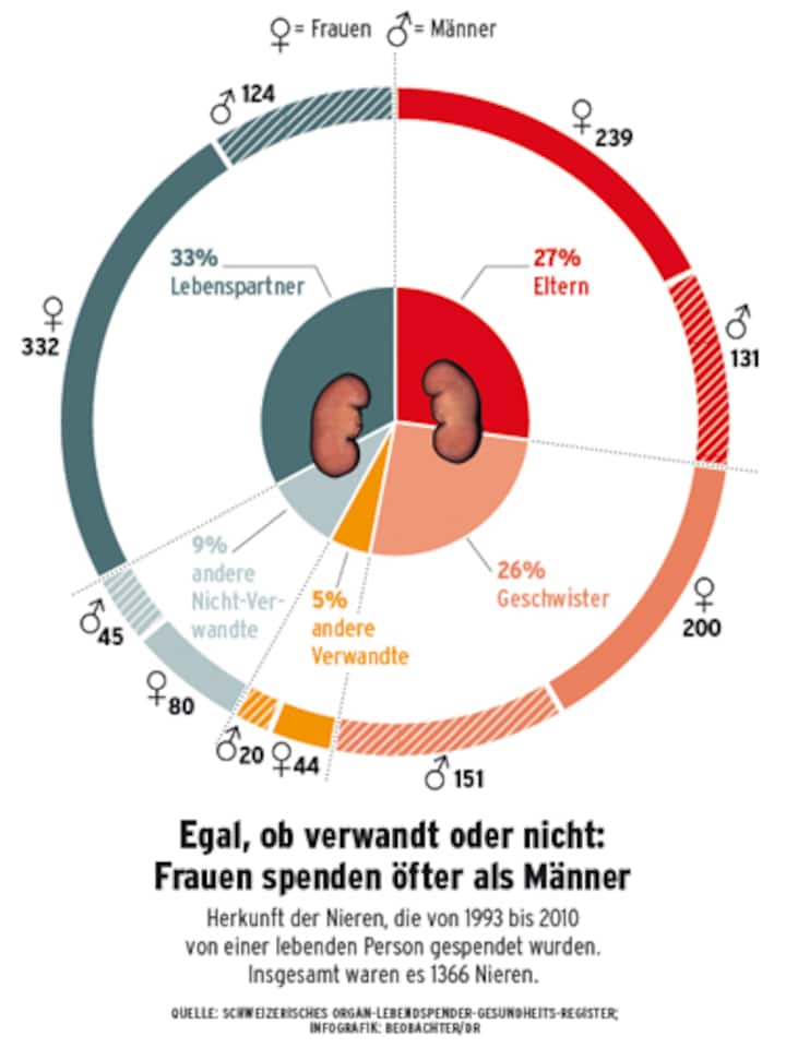 Seit 1994 wurden in der Schweiz rund 1400 Nierenlebendspenden verzeichnet. Potentielle Spender werden im wahrsten Sinn des Wortes auf Herz und Nieren geprüft, denn nur Gesunde kommen überhaupt in Frage. Mussten sie früher mit den Empfängern blutsverwandt sein, so ist das seit gut 20 Jahren nicht mehr notwendig. Das führte dazu, dass heute etwa ein Drittel aller Nierenspenden von den Partnern der Nierenkranken stammen (siehe Grafik unten). Oft geschieht das nicht nur aus reiner Selbstlosigkeit: Das Leben mit einem Menschen, der von der Dialyse abhängt, ist voller Einschränkungen, die selbstverständlich immer beide Partner betreffen.