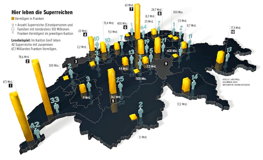 Trotz hohen Steuern haben sich im Kanton Genf mehr als 40 Superreiche niedergelassen. Internationalität, exklusive Privatschulen und -banken, die Nähe zu Frankreich und der Flughafen reizen Juweliere und alten Geldadel ebenso wie russische Oligarchen oder Stars wie Nana Mouskouri.