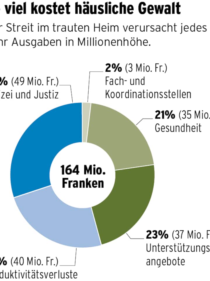 Privatsache ist häusliche Gewalt nur schon wegen der enormen Kosten nicht. Die Hospitalisierungen, damit verbundene Erwerbsausfälle, die Interventionen der Polizei, die Gerichte, Beratungsstellen und anderes, was mit häuslicher Gewalt verbunden ist, kosten laut einer Studie des Eidgenössischen Büros für die Gleichstellung von Frau und Mann 164 bis 287 Millionen Franken pro Jahr, je nachdem, von welchen Opferzahlen man ausgeht.