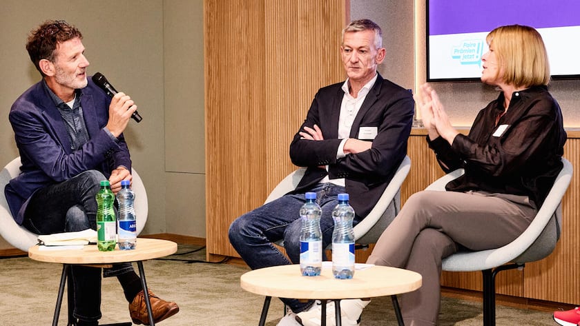 Ein Podium mit Beobachter-Redaktor Otto Hostettler, Kristian Schneider von H+, Sara Stalder von der Stiftung für Konsumentenschutz (von links) und anderen Teilnehmern (nicht im Bild)