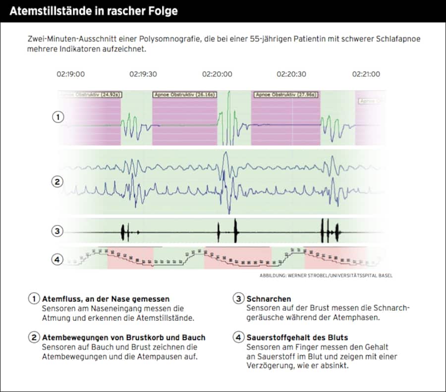 Der 57-jährige Patient, nennen wir ihn Armin Schweri, hatte schon immer einen unruhigen Schlaf. Er schnarchte, wälzte sich im Bett, schlug unkontrolliert mit Armen und Beinen um sich, rang nach Luft. Mit den Jahren wurde es schlimmer. Seine Frau lag ebenfalls häufig wach und bekam mit, wie der Atem ihres Mannes jede zweite Minute aussetzte. Zehn Sekunden, 20, manchmal sogar 30 Sekunden dauerten die Pausen. Brustkorb und Bauchdecke hoben sich in wilder Anstrengung, Luft in die Lungen zu pumpen, derweil die oberen Atemwege fest verschlossen blieben. Bis sie sich, unter dem enormen Bedürfnis des Körpers nach Sauerstoff, explosionsartig öffneten.