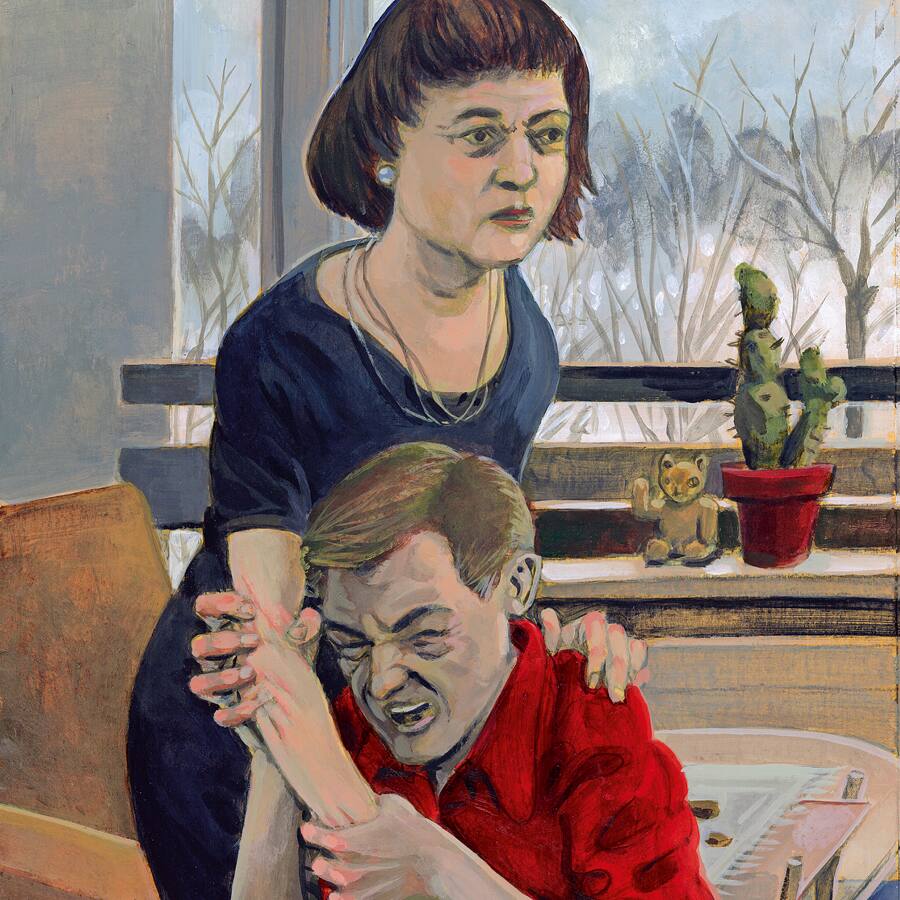 Während sie erzählt, sitzt er mit am Tisch. Sein Blick ist stumpf. Er schreit und jault, ist unruhig. Zwischendrin schlottert er minutenlang am ganzen Körper. An seinem Mund hängen Speichelfäden. Manchmal versucht sie, ihn ins Bett zu locken. «Komm, Schätzeli, komm ein bisschen ins Bett.» Aber er will nicht. Manchmal muss sie ihm die Windeln wechseln. Er hält kaum still, und sie gerät ausser Atem.