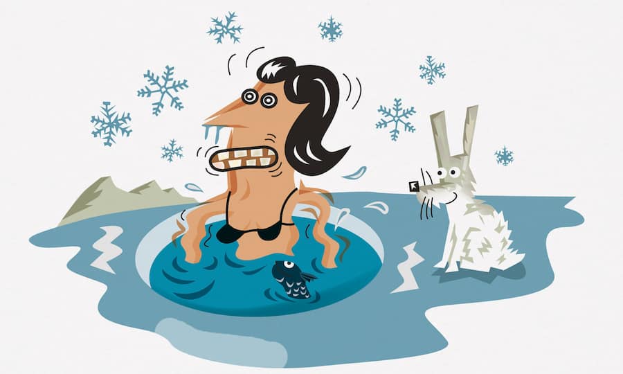 Sinkt die Körpertemperatur nach längerer Abkühlung im Swimmingpool unter die gewohnte Temperatur von 37 Grad, steuert der Organismus mit allen verfügbaren Mitteln dagegen. Es geht ums Überleben, also tut er, was er kann. Erst stellt er die kläglichen, uns im Lauf der Evolution verbliebenen Körperhaare auf, in der Hoffnung, wärmende Luftschichten im «Fell» anzusammeln. Wegen der kärglichen Behaarung des Durchschnittsmenschen resultiert daraus nur die wenig hilfreiche Gänsehaut. Also werden in der nächsten Stufe des Kampfs gegen die Kälte die Muskeln in schneller Folge abwechselnd angespannt und entspannt, um dadurch Wärme zu produzieren. Wir beginnen unkontrolliert zu zittern. Da der Mechanismus auch Muskeln im Gesicht betrifft, klappern in schweren Fällen von Frieren irgendwann die Zähne mit.