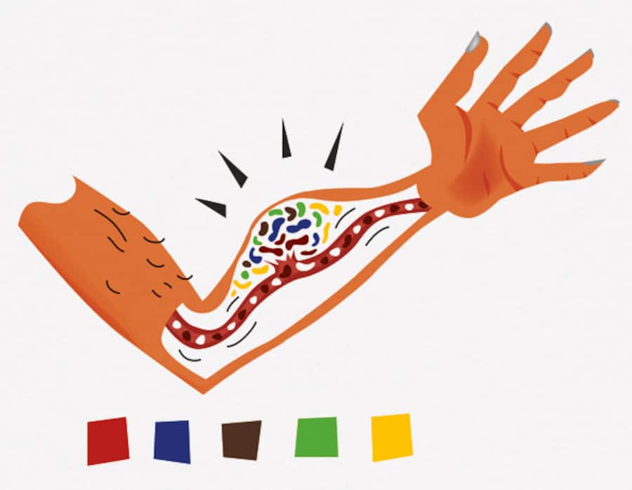 Blut verdankt seine rote Farbe dem Farbstoff Hämoglobin, aus dem die roten Blutkörperchen zum Grossteil bestehen. Wird ein Blutgefäss beschädigt, fliesst Blut in das umliegende Gewebe. Wenn es dort gerinnt, verfärbt es sich bläulich dunkelrot. Mit der Zeit wird es durch Enzyme abgebaut. Wie weit der Abbau schon vonstattengegangen ist, kann man anhand der aktuellen Färbung erkennen. Zuerst wird das rote Hämoglobin zu bräunlichem Verdoglobin abgebaut. Dieses wiederum wird in Biliverdin umgewandelt, das grün ist. Die gelbbraune Färbung entsteht durch die Umwandlung zum Abbauprodukt Bilirubin. Und bald danach hat die Stelle wieder ihre natürliche Farbe zurück.