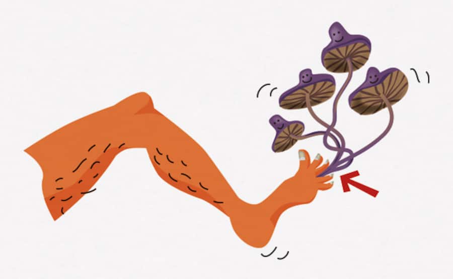 Wenn Sie Durchschnittsfüsse haben, wovon wir hier ausgehen wollen, hilft ein Blick auf den eigenen, auch pilzfreien Fuss weiter. Sie werden feststellen, dass der dritte und der vierte Zeh sich offenbar besonders zueinander hingezogen fühlen und eng nebeneinanderstehen. Daher hält sich Feuchtigkeit zwischen ihnen besonders lange, Fussschweiss zum Beispiel. Je feuchter und wärmer die Umgebung, desto wohler fühlt sich der Fusspilz. So findet er an diesem Ort meist sein Lieblingsplätzchen. Orthopäden bestätigen, dass bei Menschen mit Vorliebe für modisch-spitzes Schuhwerk der kleine Zeh oft so verformt ist, dass er eng an den vierten Zeh gepresst wird. In solchen Fällen findet der Pilz dort seinen Lieblingsplatz.