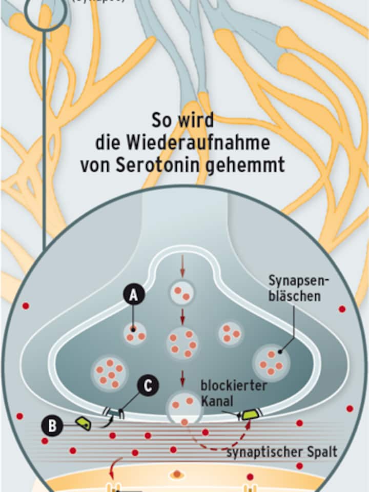 Serotonin A agiert als Botenstoff (Transmitter) zwischen den Nervenzellen. Das Medikament B blockiert den Rücktransportkanal C. So wird der Rücktransport des Serotonins in die Nervenzelle verhindert.