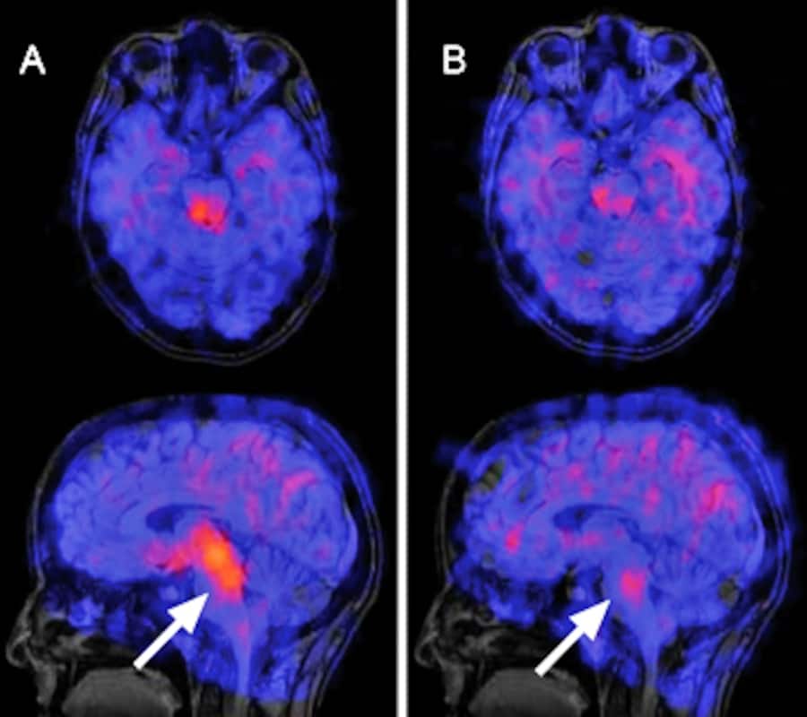 Indirekte Darstellung der Serotoninaufnahme im Gehirn vor und nach sechswöchiger Behandlung mit dem SSRI Paroxetin (Handelsname Deroxat): Die Bilder zeigen die pharmakologische Wirkungsweise des Medikaments, beweisen aber nicht dessen Wirksamkeit.