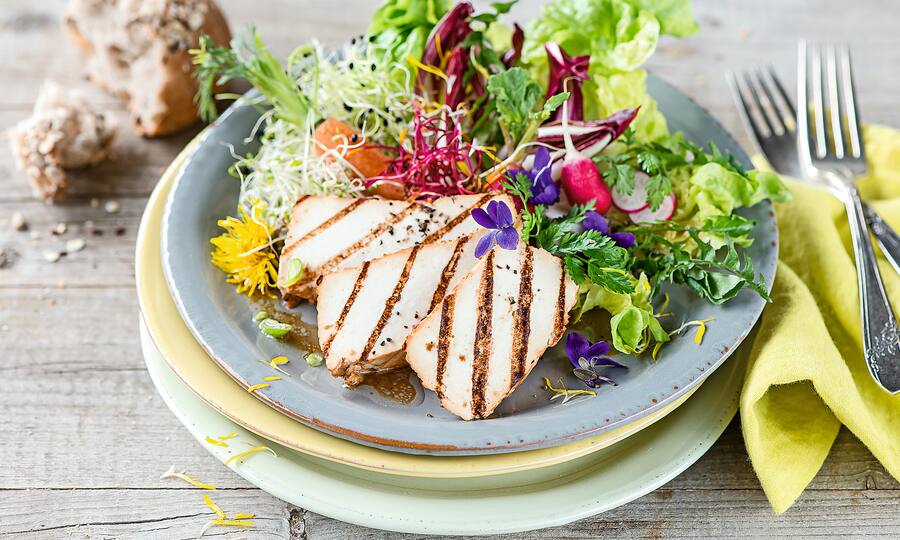 - Salat, Gemüse, Kräuter und Blüten auf Tellern anrichten.