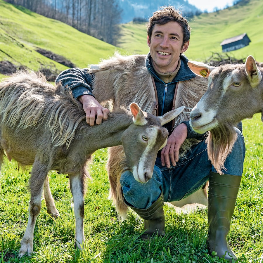 Weil es Odermatt schade fand, die Geissenfelle wegzuwerfen – «es gab in herkömmlichen Vertriebskanälen gerade mal noch 20 Rappen dafür» –, suchte er auch dafür eine neue Verwertung. Und fand einen Näher, der daraus Westen herstellt. Oft trägt Odermatt selber eine. Als er beim Fototermin auf der Wiese nach seinen Ziegen ruft und dann von ihnen umringt wird, sieht es fast so aus, als sei er ein Teil der Herde.