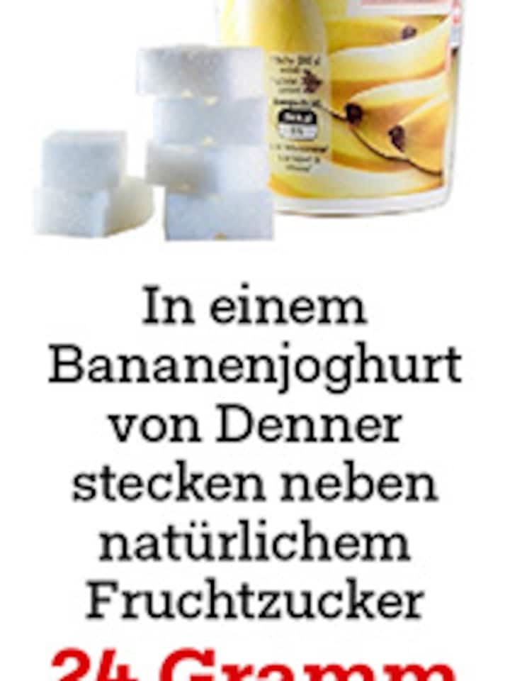 Schon zum Zmorge konsumieren viele mehr als die empfohlene Tagesdosis Zucker. Und wissen nichts davon: Mit einem Bananenjoghurt von Denner löffeln sich Konsumenten 24 Gramm zugesetzten Kristallzucker auf die Zunge, eine Drei-Deziliter-Flasche Orangensaft von Coop spült 27 Gramm Fruchtzucker in den Magen. In den aufgedruckten Nährwerttabellen fehlen diese Zuckerangaben aber. Sie sind in der Schweiz nicht vorgeschrieben.